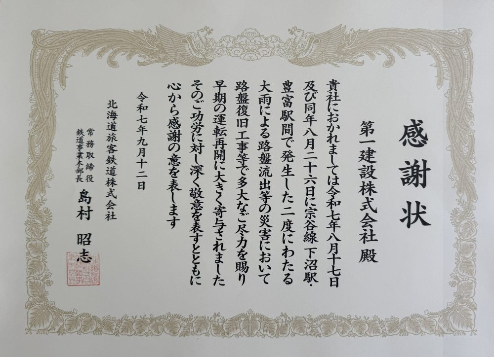 JR北海道様より災害復旧対応への感謝状贈呈