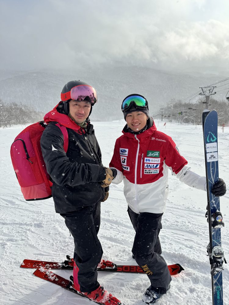 名寄ピヤシリスキー場にての1枚(右:五十嵐晴冬選手、左:当社社長 寺島峻介)